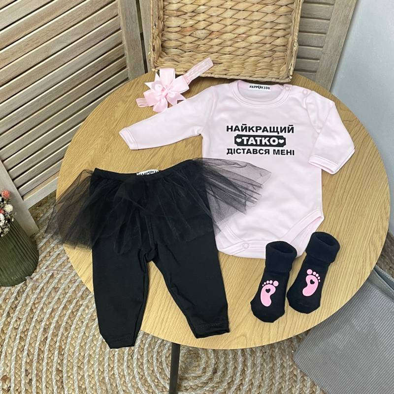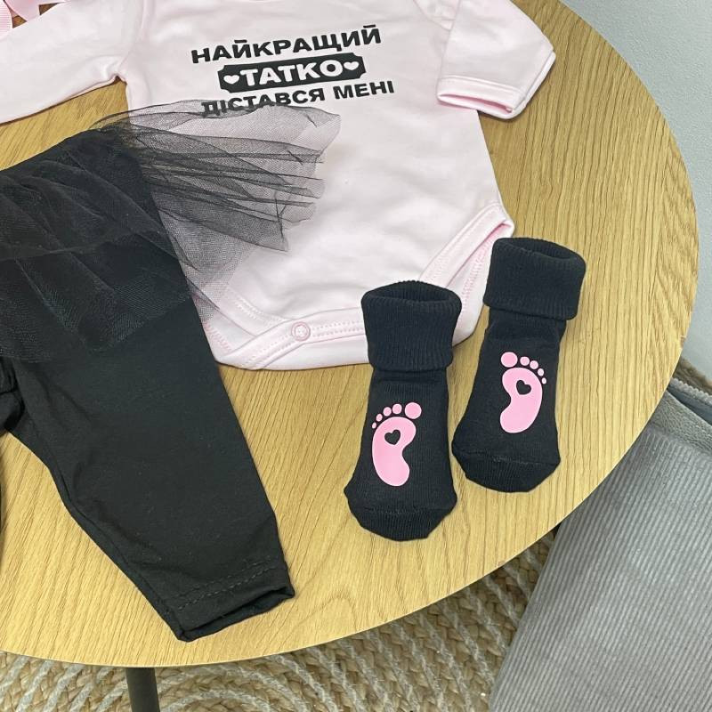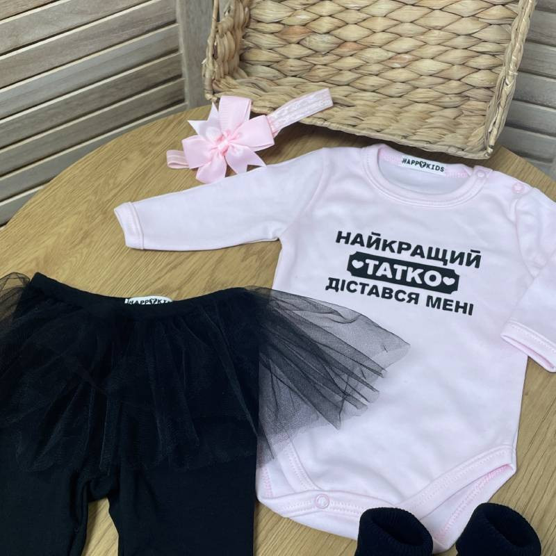 Подаруйте вашій маленькій принцесі унікальний боді з ніжним написом "Найкращий татко дістався мені". Цей боді стане ідеальним вибором для особливих моментів, фотографій та просто для повсякденного носіння.