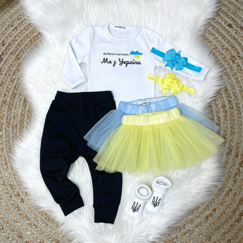 Якісні боді з принтом для маленьких чудово доповнюються штанами, шапочкою та патріотичними шкарпетками.