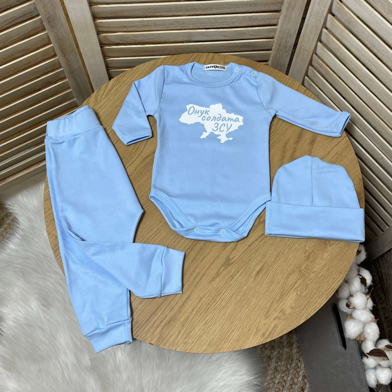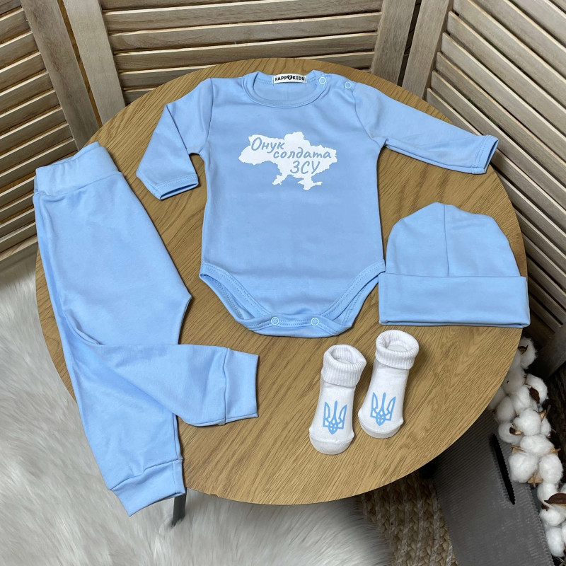 Якісні боді з принтом для маленьких чудово доповнюються штанами, шапочкою та патріотичними шкарпетками.