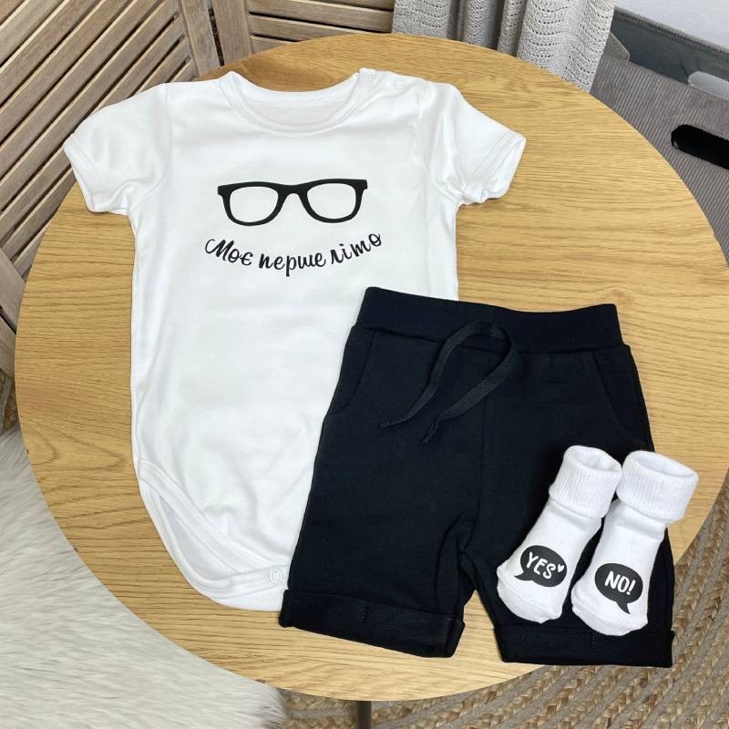 - Дизайн: Однотонна основа з яскравим написом "Моє перше літо", створює милий і стильний образ для новонародженого.