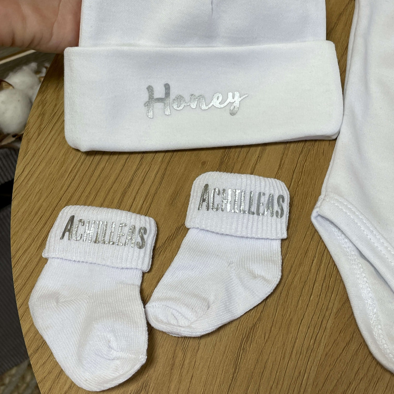 Можна доповнити аксесуарами. що ідеально пасують до боді - шапочка з написом, штанці в тон, шкарпетки з іменем малюка.