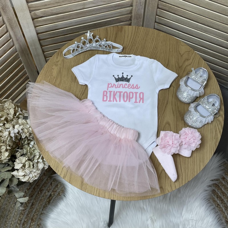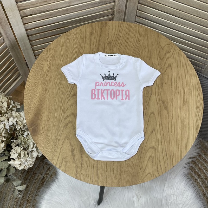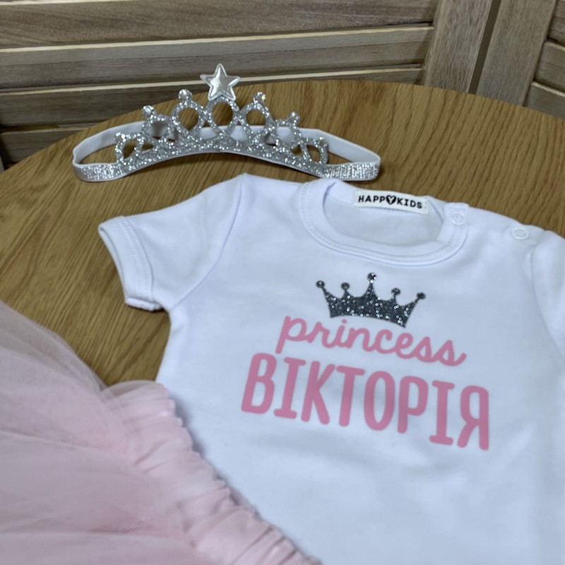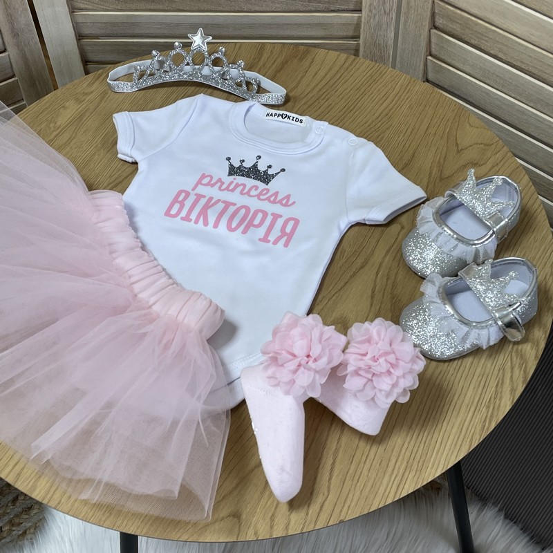 Оригінальний боді з іменем маленької принцеси з блискучим написом на перший день народження стане оригінальним та стильним на день народження донечки, ідеально пасує для домашньої фотосесії та святкувань.