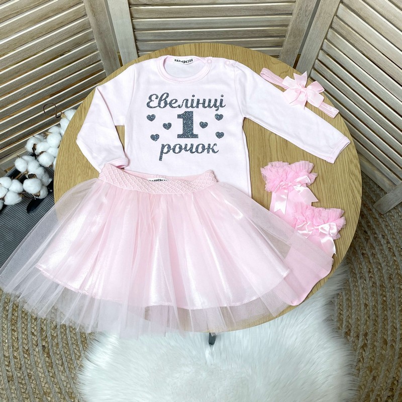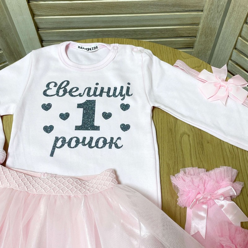 Боді на перший день народження для дівчинки з іменем маленькоі іменинниці і цифрою виглядає дуже святкового і шикарно.