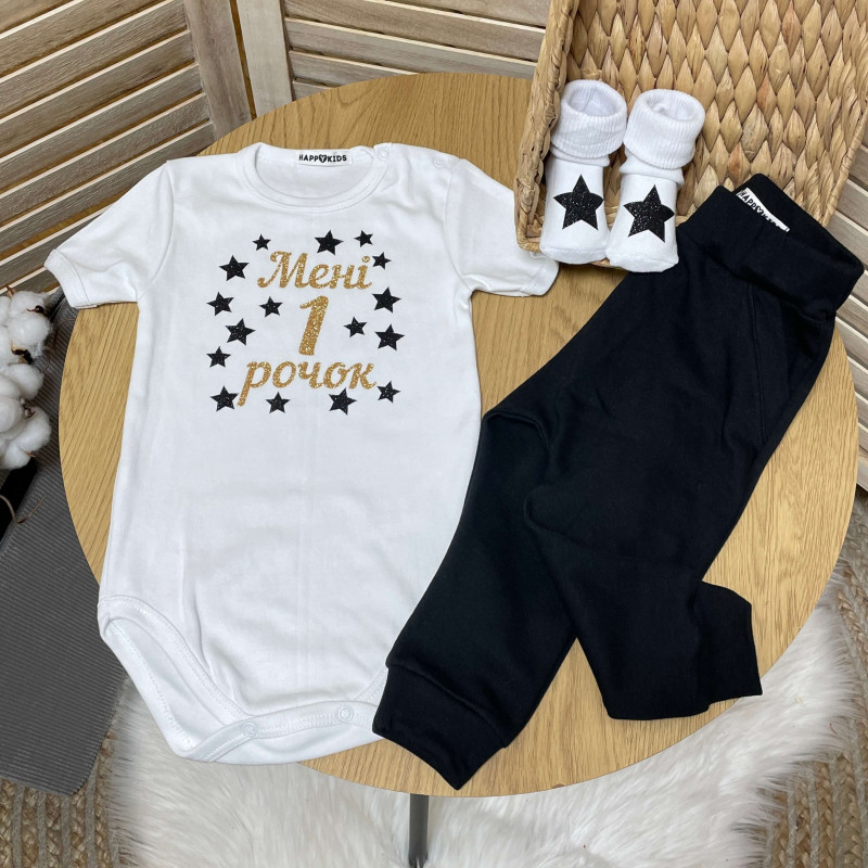 Оригінальне боді для хлопчика з сяючим блискучим написом "Мені 1 рочок" з зірочками– ідеальне вбрання для малюка на його перший день народження. В якому він виглядатиме стильно, модно, і актуально.
