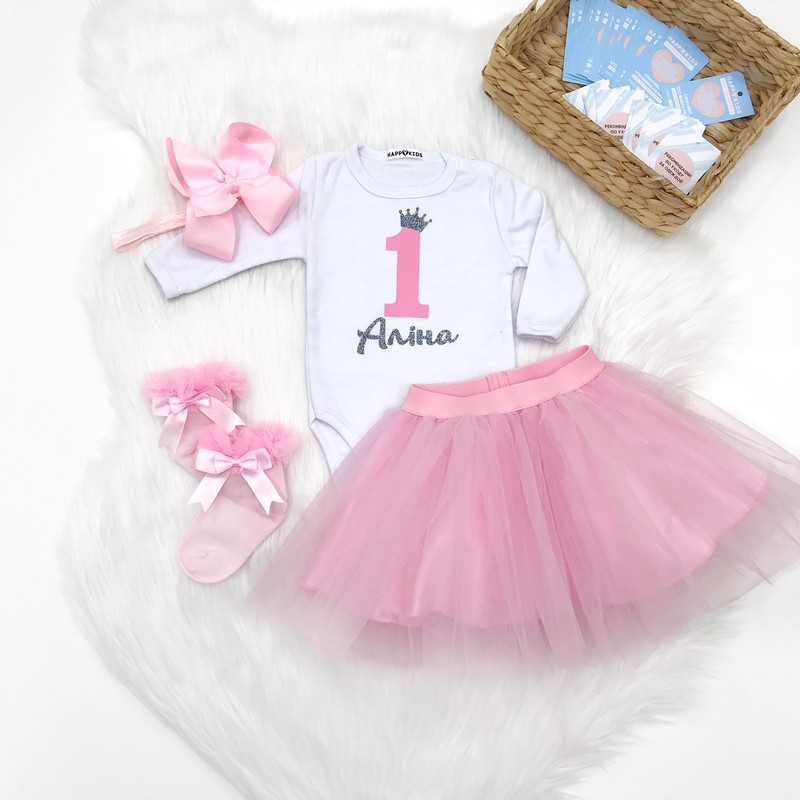 Святковий боді для іменинниці на перший день народження з великою цифрою одиничкою.