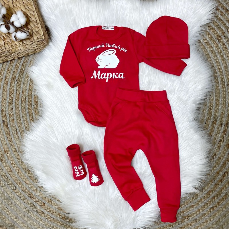 Боді з зображенням зайчика символу року чудово доповнюється шкарпетками з новорічним принтом і бавовняними штанцями.