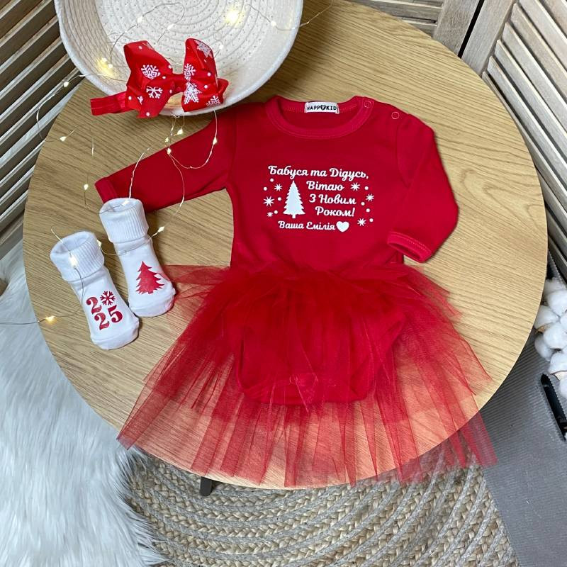 Святкова боді-сукня для дівчинки з милим написом для "Привітання з Новим роком" — ідеальний вибір для вашої маленької принцеси! Цей стильний та зручний одяг створений спеціально для новорічних свят, аби привітати ваши рідних та близьких.
