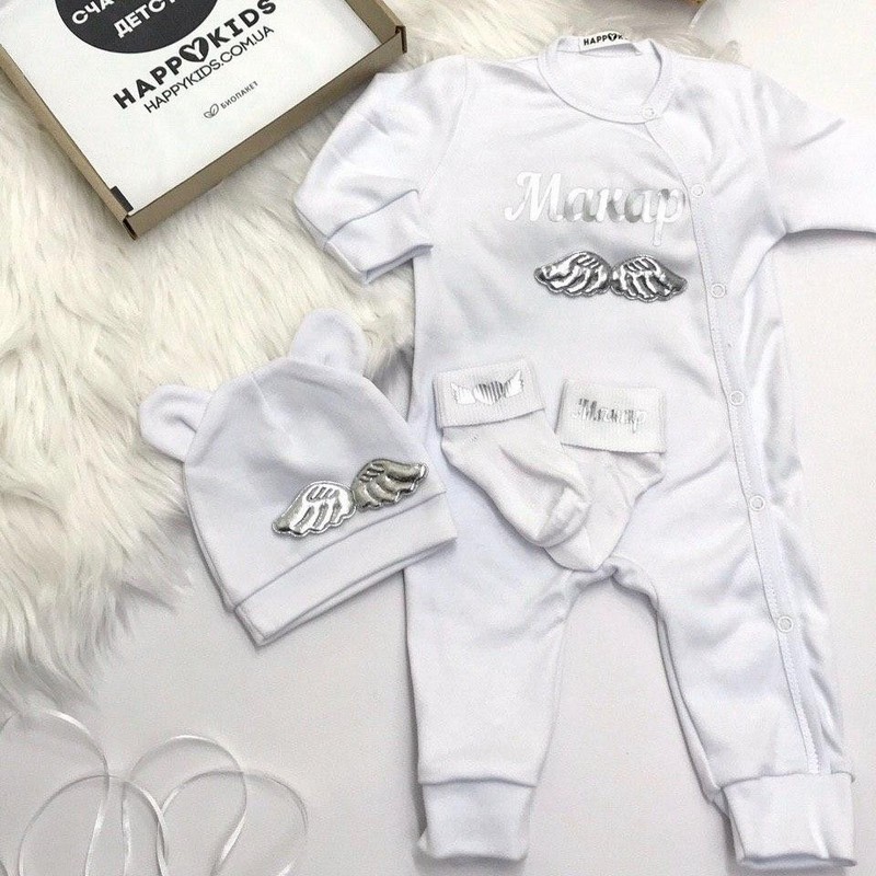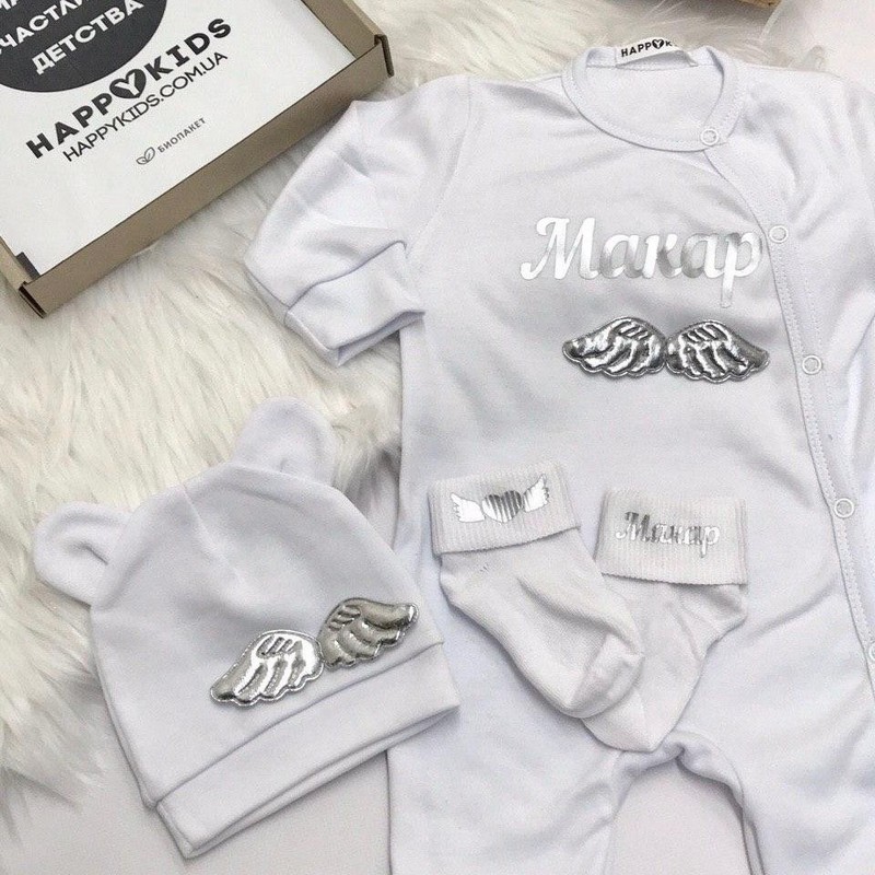 Зручний оригінальний сліп для новонародженого з іменем дитини та крилами янголя на спині - чудовий одяг для найменших крихіток янголяток. Чудово підходить в пологовий будинок, оригінальний подарунок новонародженій дитині.