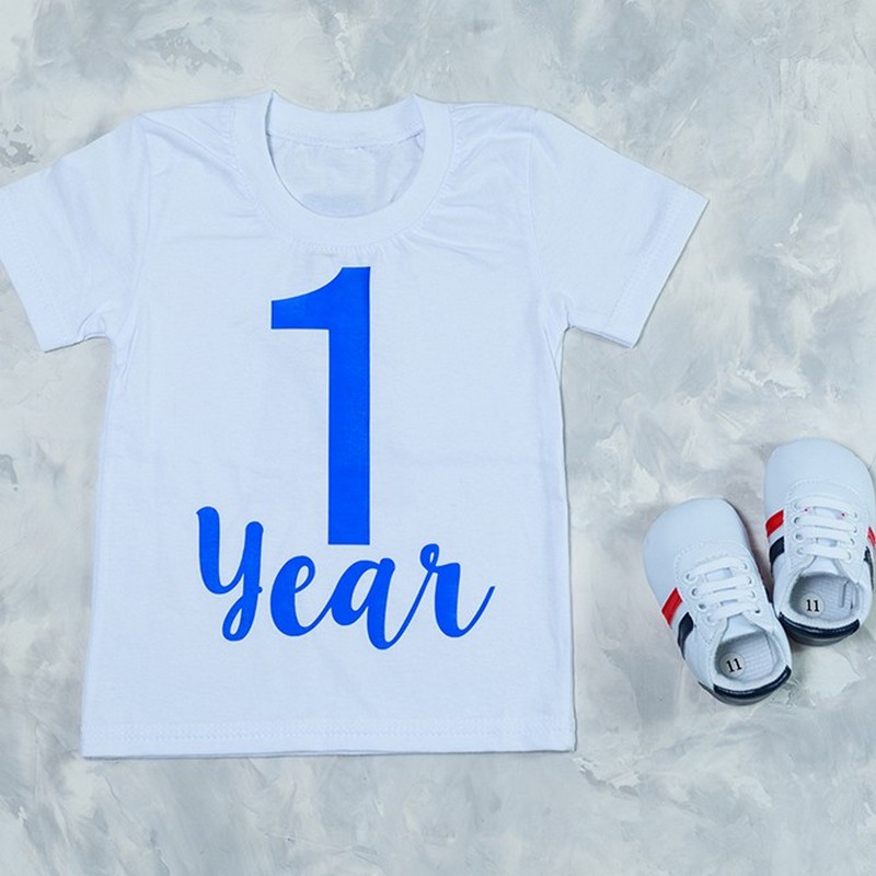 Оригінальна базова однотонна футболка хлопчику з написом на перший день народження зробить стильним іменинника, ідеально пасує для свята дня народження і домашньої фотосесії.
