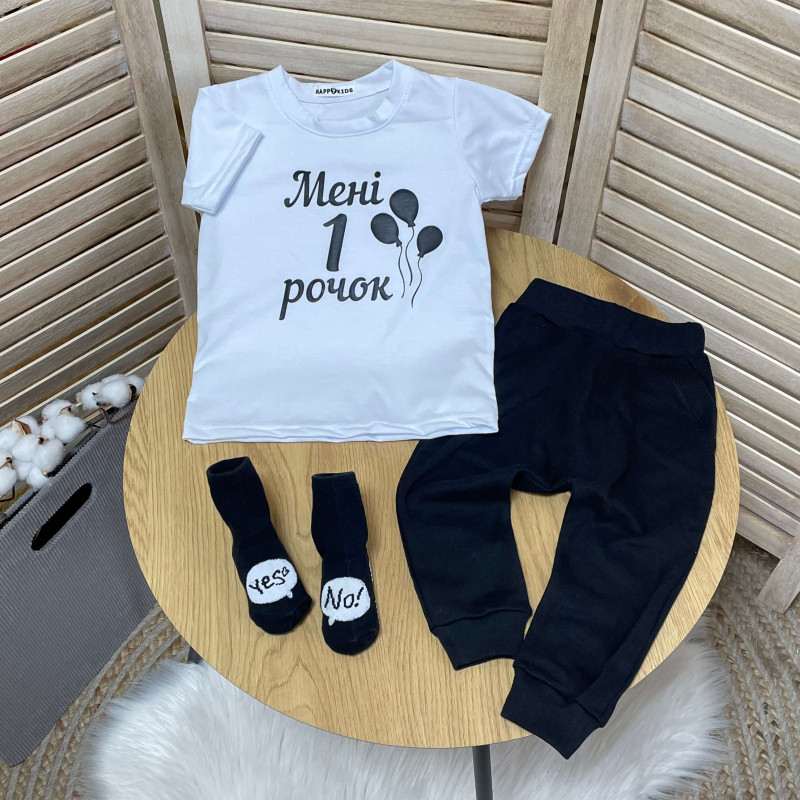 Оригінальна базова однотонна футболка хлопчику з написом на перший день народження зробить стильним іменинника, ідеально пасує для свята дня народження і домашньої фотосесії.