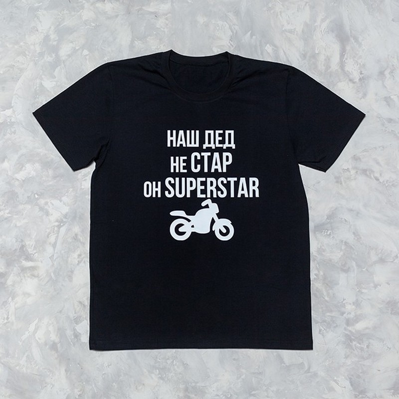 Футболка з написом для дідуся "Наш дід не старий він суперстар" з мотоциклом