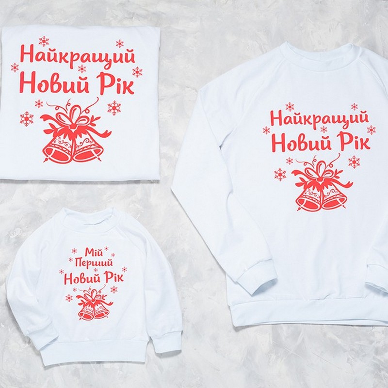 Новорічні футболки в одному стилі з оригінальним написом найкращий вибір для всієї родини ідеально підходить одяг на перший Новий рік дитини. Також чудова ідея для подарунку, сімейної фотосессії або новорічного родинного свята.