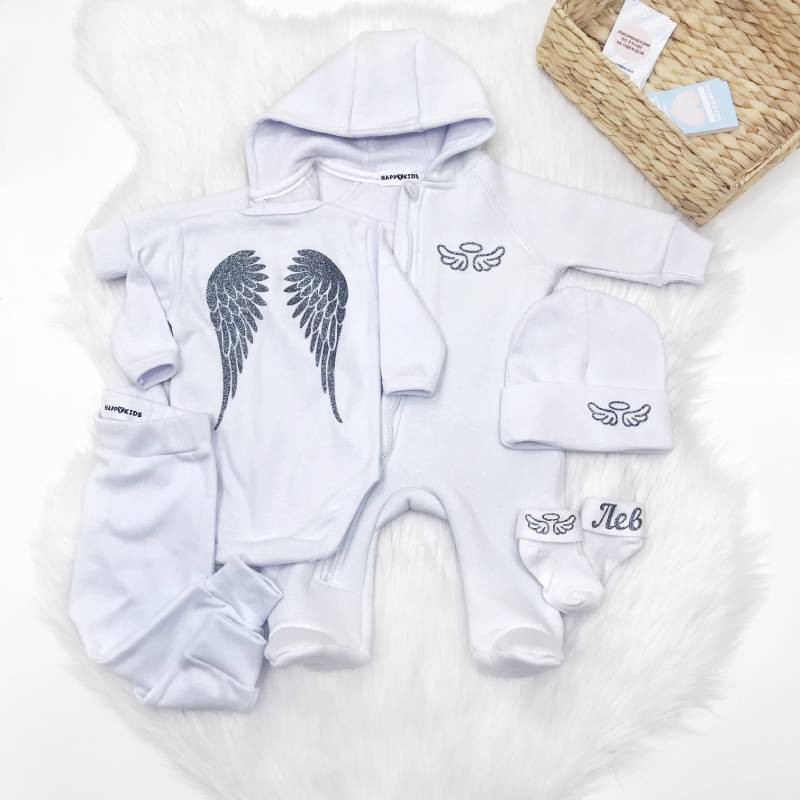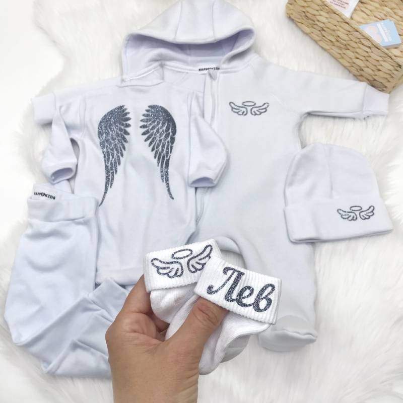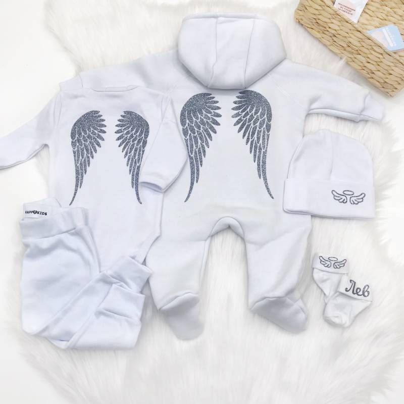 - Комбінезон з крилами на спині та принтом німб з крилами.