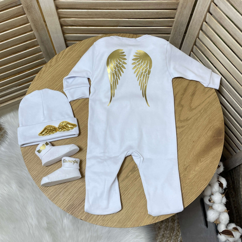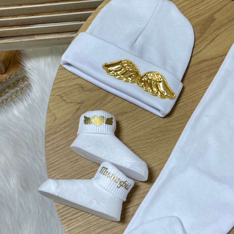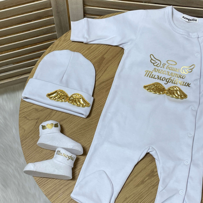 У наборі: чоловічок з іменем дитини і крилами на спині, шапочка з відворотом і об'ємними крилами, шкарпетки з іменем дитини/на другом сердечко з крилами.