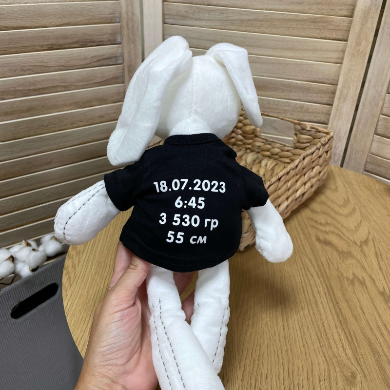 На спинці футболки зайчика можна вписати дані народження дитини, які залишаться в пам'яті на все життя.
