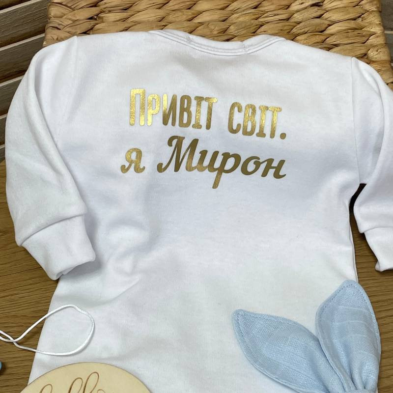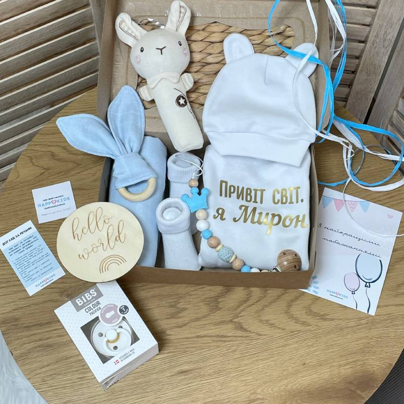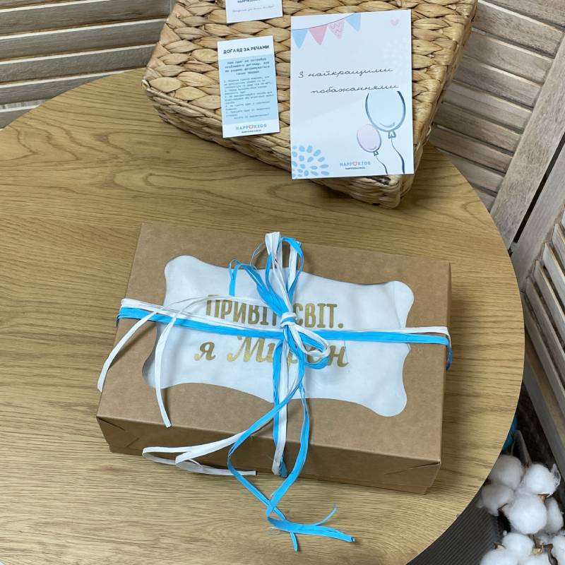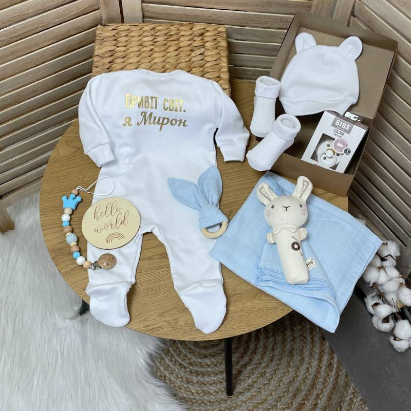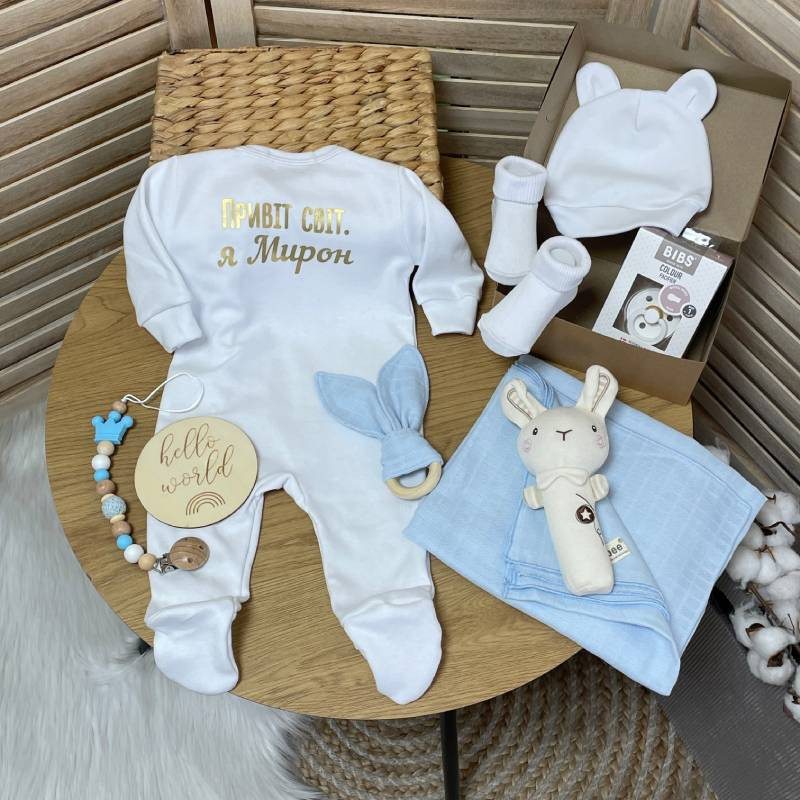 Зробіть перші дні життя вашого малюка особливими за допомогою унікального іменного набору "Привіт, світ". Це ідеальний подарунок для новонародженого, що поєднує стиль, комфорт і пам'ятну індивідуальність.