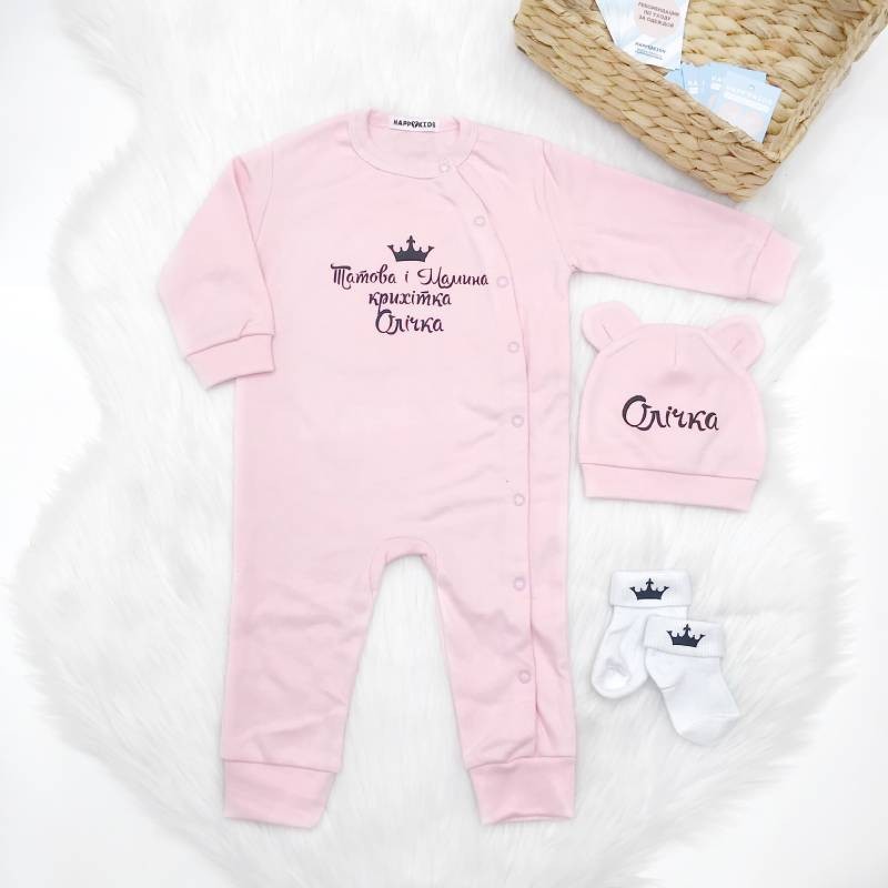 Цей сліп для новонародженої дівчинки з ім’ям стане чудовим вибором для виписки з пологового будинку, фотосесії або першого гардероба вашої крихітки.