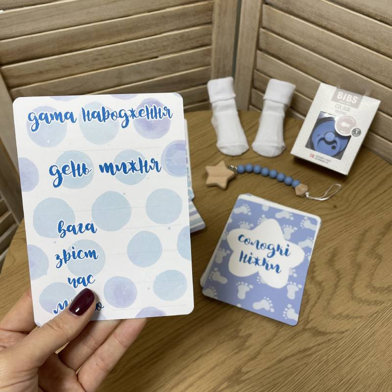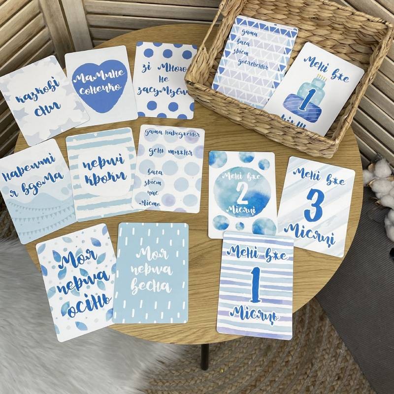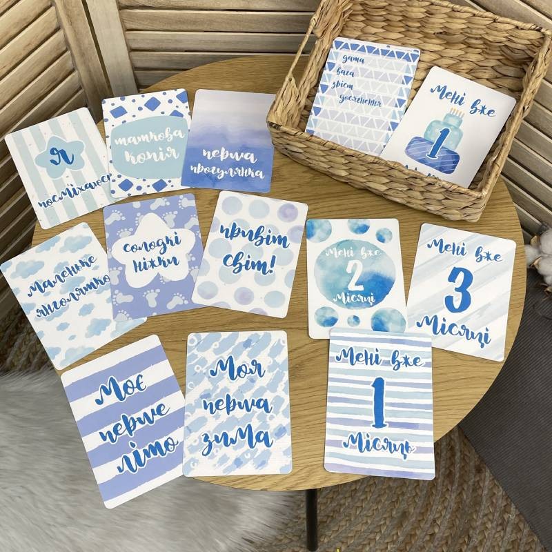 - 20 щільних картонних листівок із незабутніми моментами першого року життя дитини