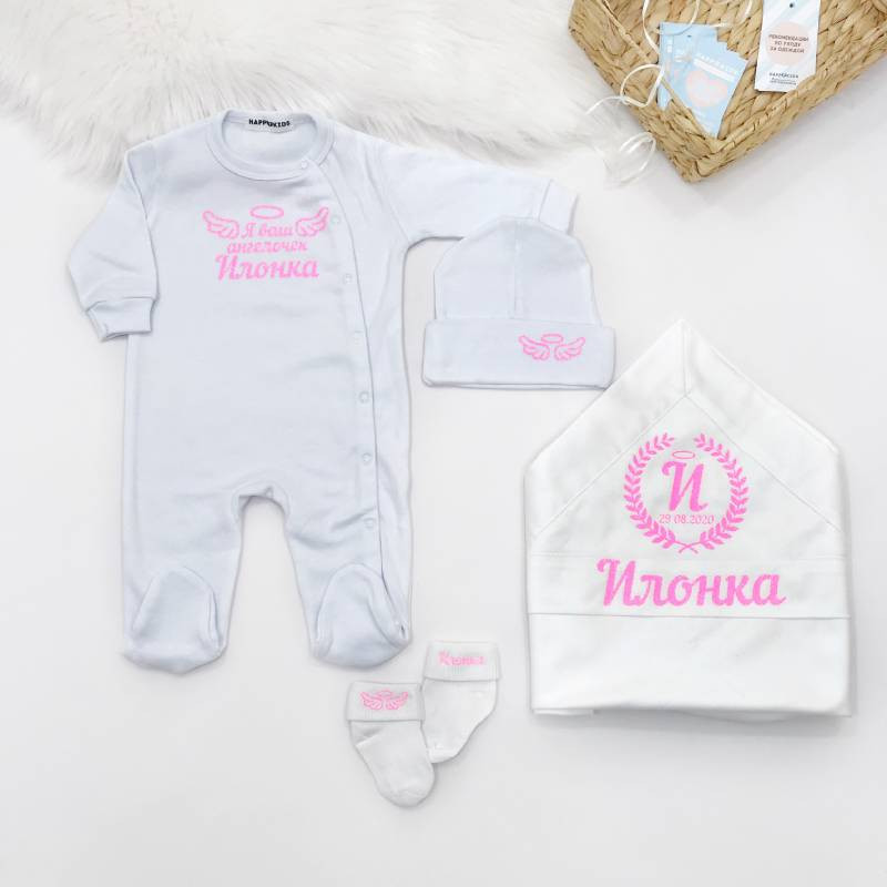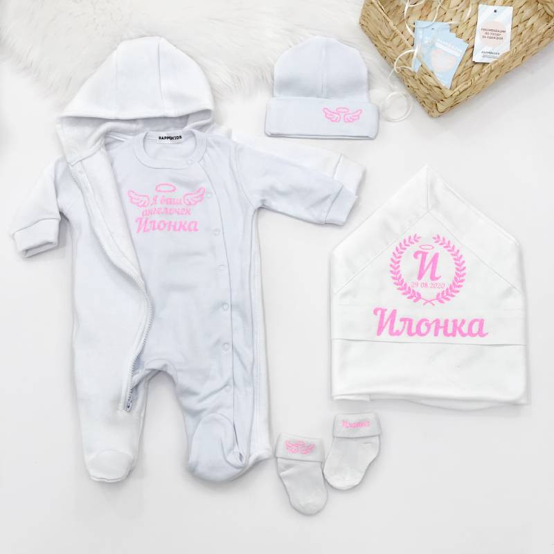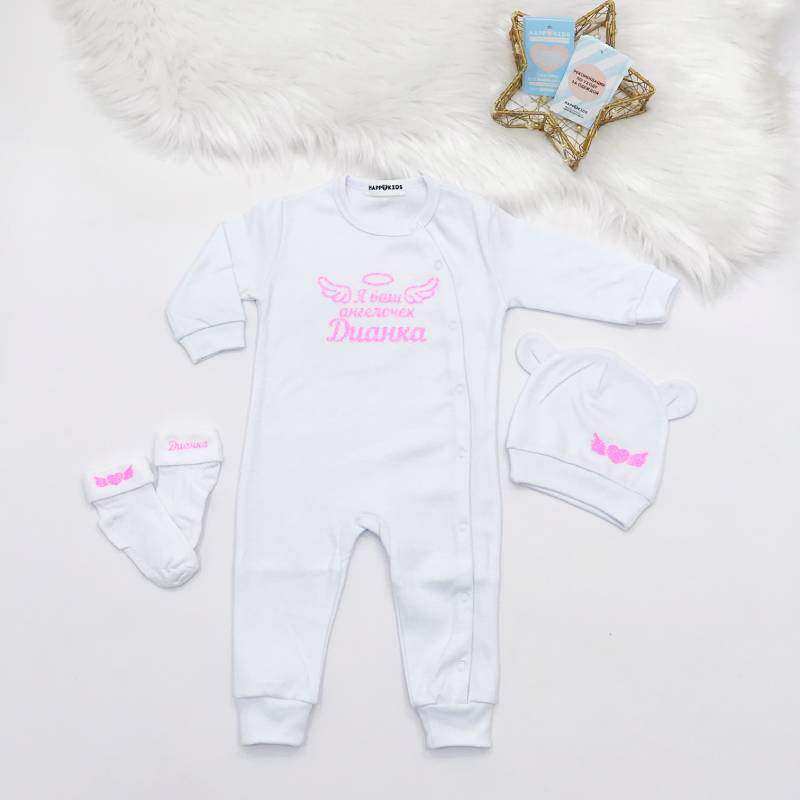 Кожен елемент набору оздоблений ніжними мотивами та елегантним написом "Я ваше янголятко", що додає натхнення та тепла.