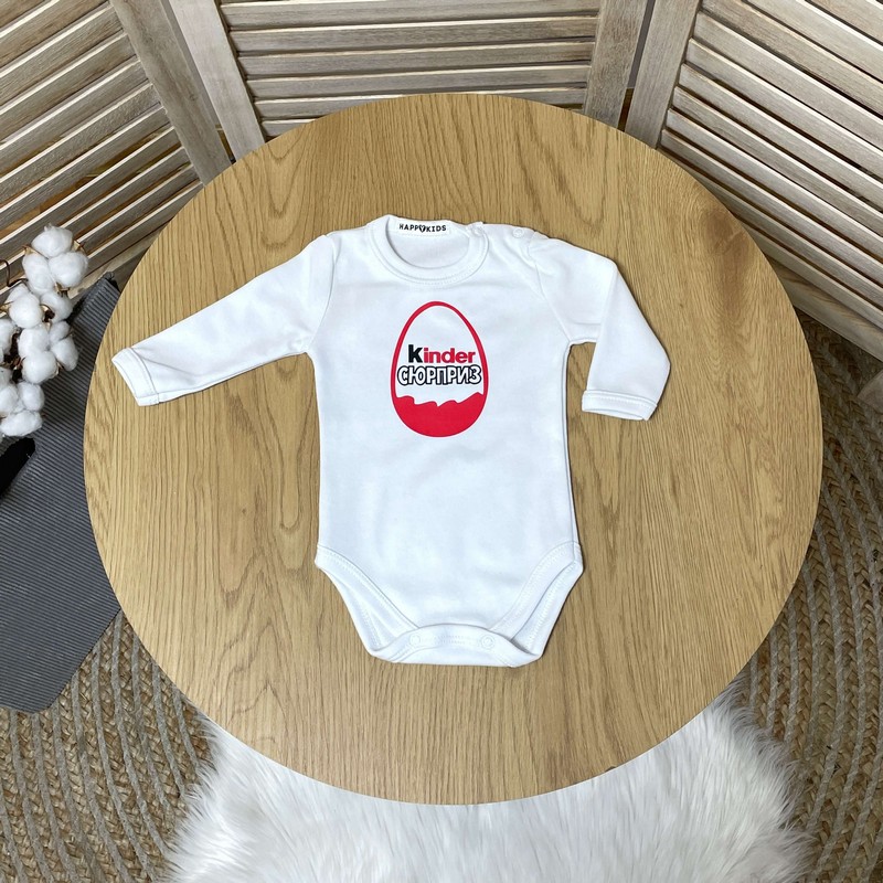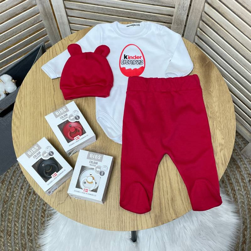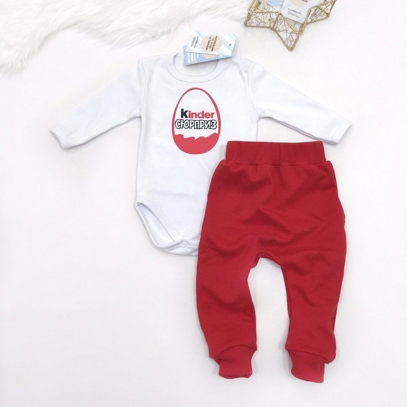 Стильний комплект для хлопчика з улюбленим принтом кіндер сюрприз складається к бавовняного боді і червоних штанців.
