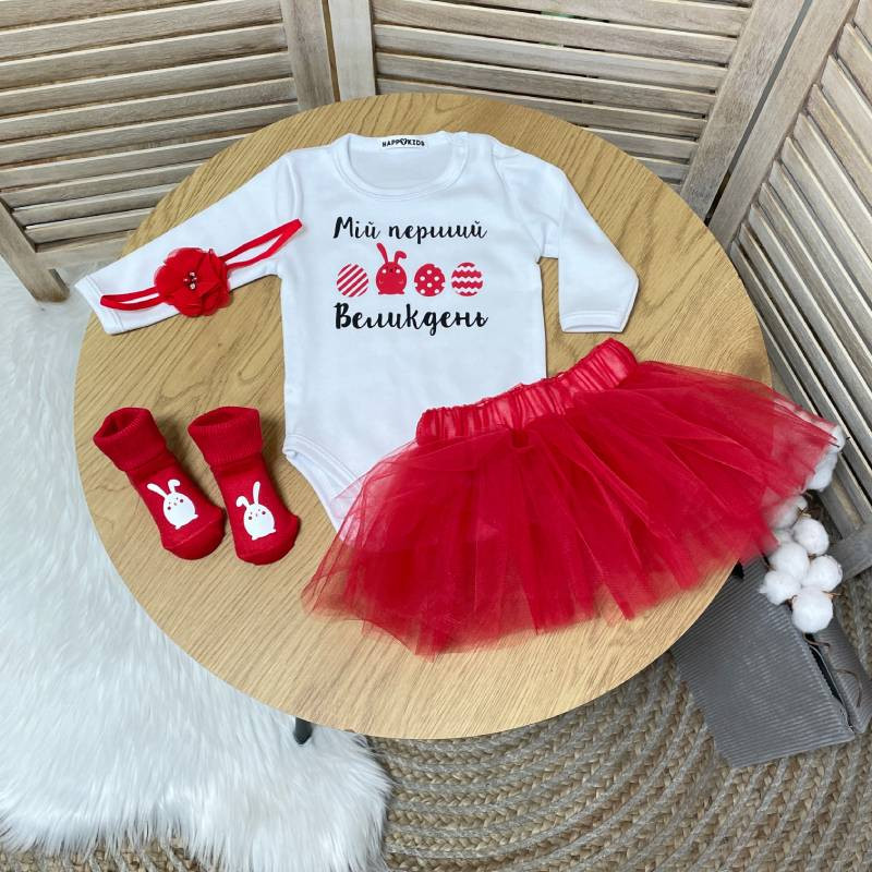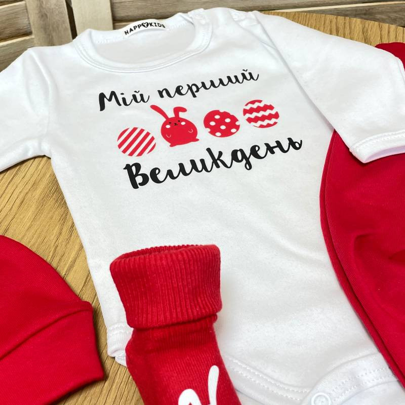 - Боді білий з чорно-червоним написом "Мій перший Великдень"