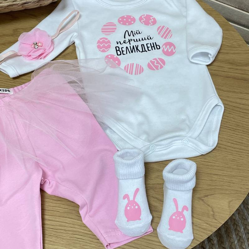 Зберіть незабутні спогади про перший Великдень вашої маленької принцеси за допомогою нашого чарівного комплекту дитячого одягу з ніжним написом "Перший Великдень". Цей чудовий комплект створений для створення незабутнього святкового настрою і зробить святкування особливим.