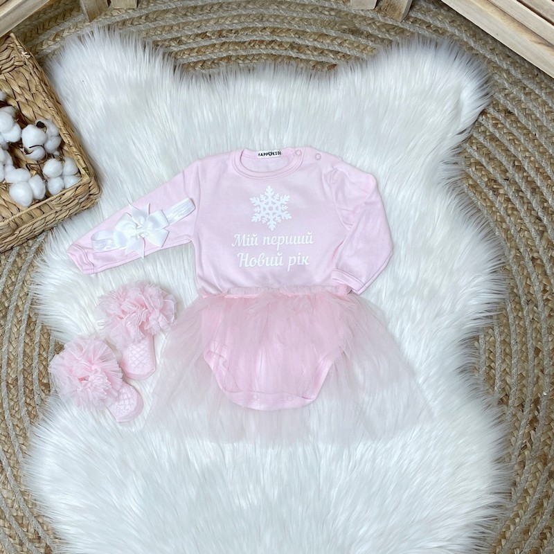 Нарядний універсальний комплект на перший новий рік підійде новородженій дівчинці або дитині до року. Доповнюй будь-якими аксесуарами на свій смак і створюй свій неповторний новорічний образ.