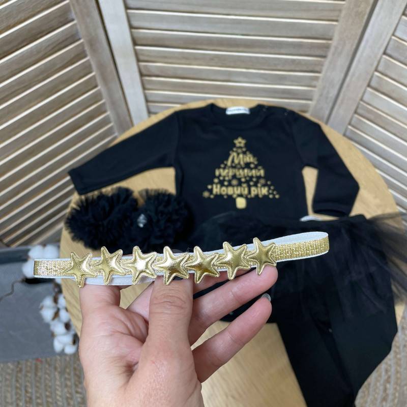 В комплекті: Чорний боді з золотим написом, лосіни зі спідничкою, носочки з рюшею, пов'язка з зірочками.