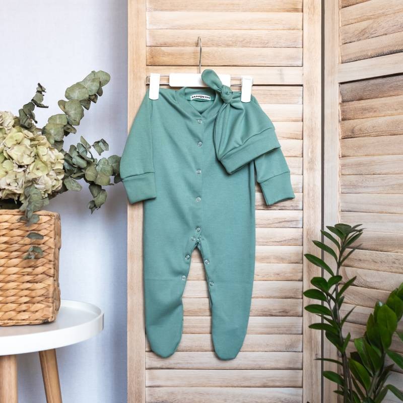 В наборі 3 боді молочного, блакитного, оливкового кольорів та шапочки до них.