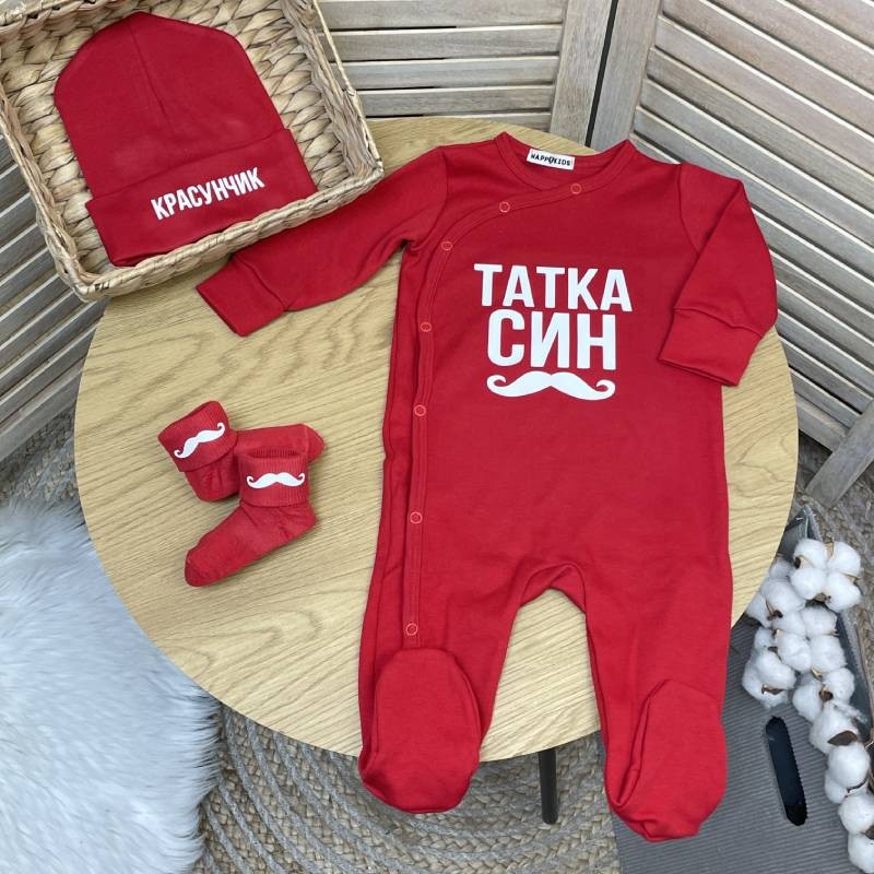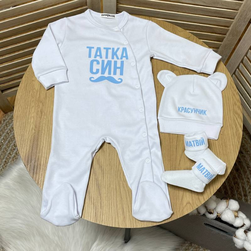 Набір для новонародженого "Татка син" з вусами — це більше, ніж одяг. Це можливість підкреслити любов та гордість татка за свого маленького хлопчика. Замовляйте вже сьогодні, щоб зробити перші дні вашого малюка незабутніми!