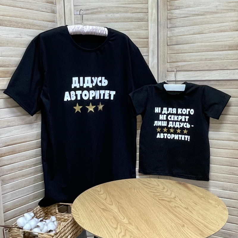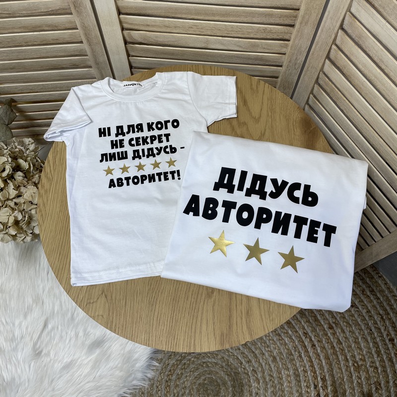 Комплект футболок з написом "Дідусь авторитет" та "Ні для кого не секрет-лиш дідусь авторитет" ідеальний спосіб підкреслити авторитет і любов дідуся в сім’ї. Подаруйте дідусеві та його онукам можливість відчути себе справжньою командою із цим стильним комплектом футболок.
