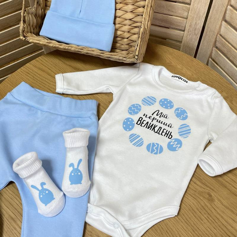 Наш комплект для новонародженого хлопчика з написом "Перший Великдень" - це чудовий спосіб відзначити особливий святковий момент у житті вашої сім'ї.