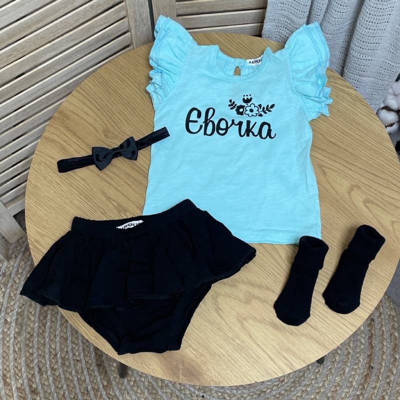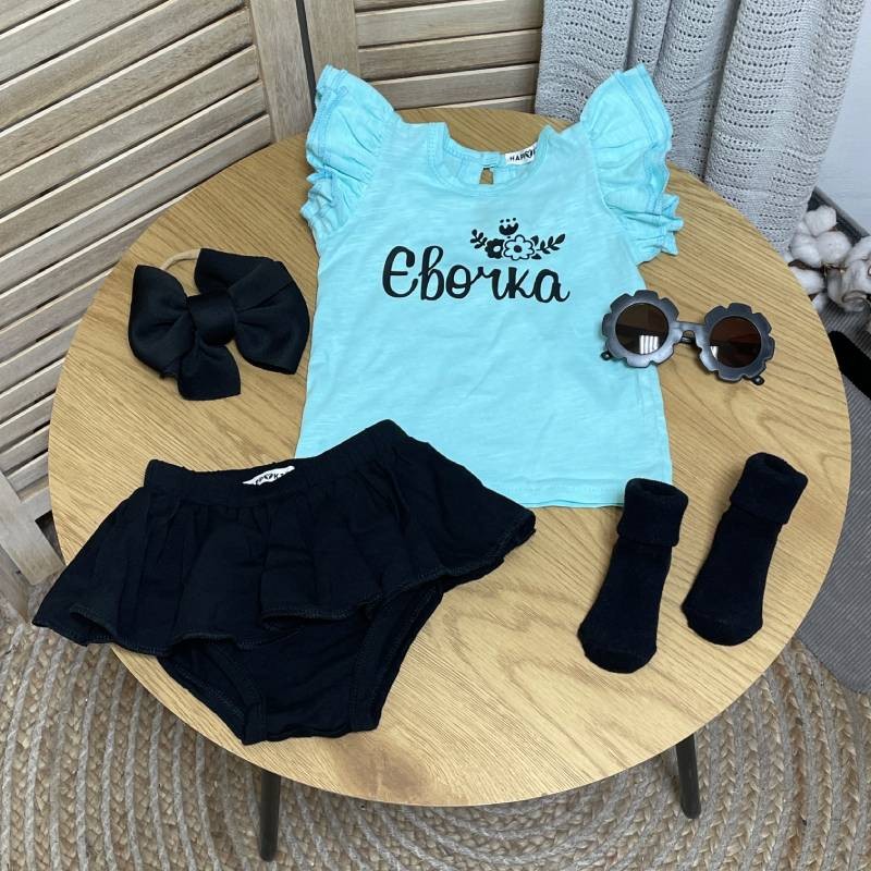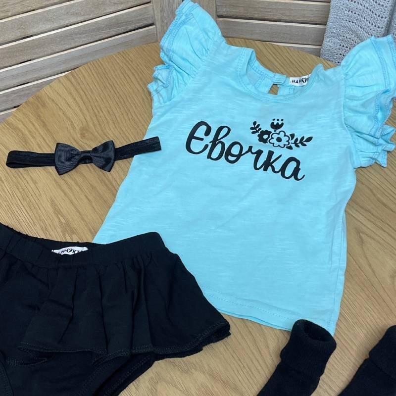 У комплекті: Футболка з кольором на вибір, чорні трусики-блумери, бантик