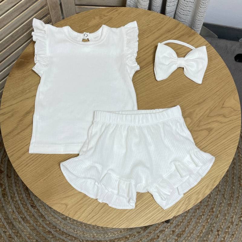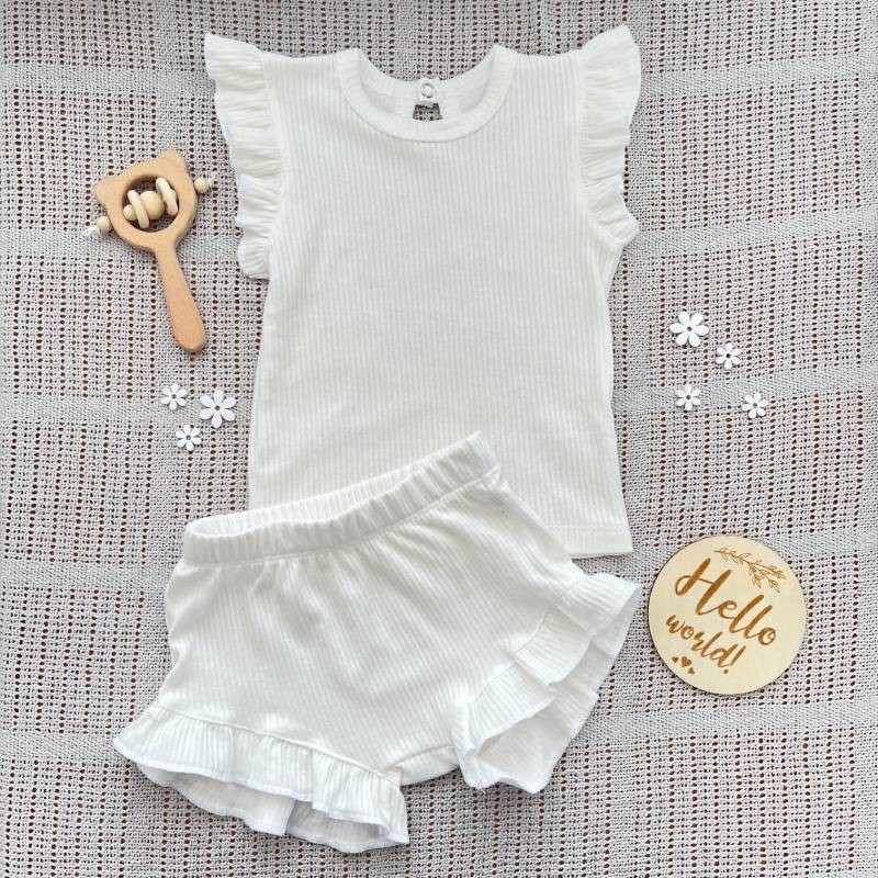 Ніжний і стильний літній комплект для дівчинки з рюшею — ідеальний вибір для теплих днів. Цей комплект стане улюбленим образом малечі завдяки комфортному крою та чарівному дизайну з рюшами. Виготовлений з тканини - рубчик.
