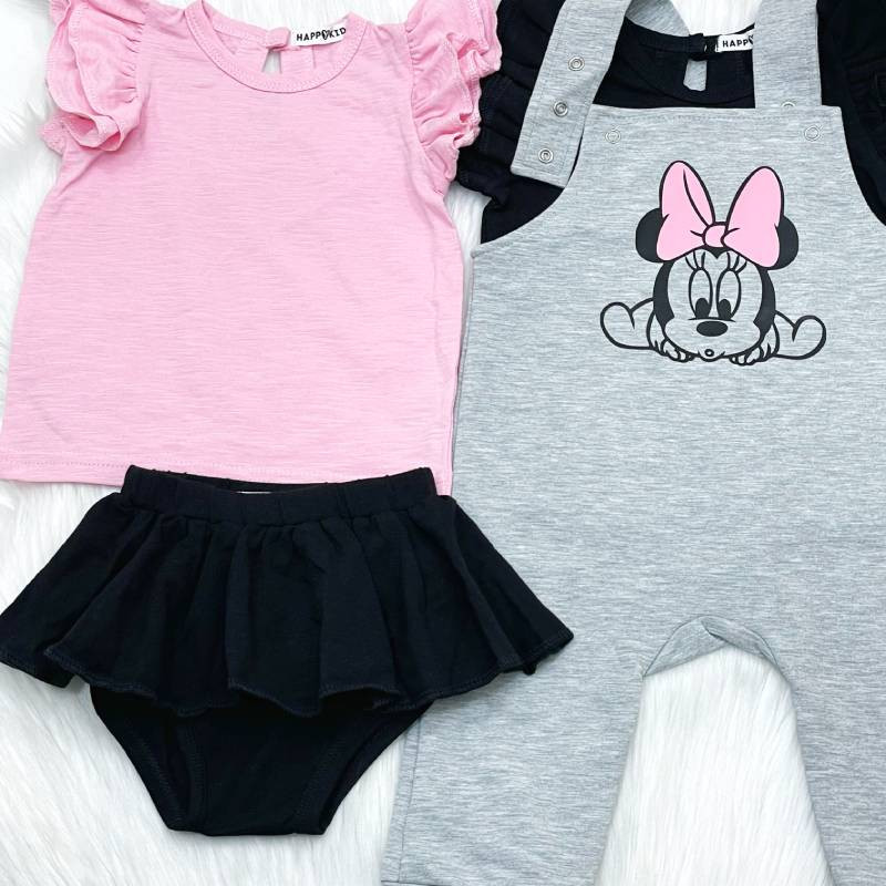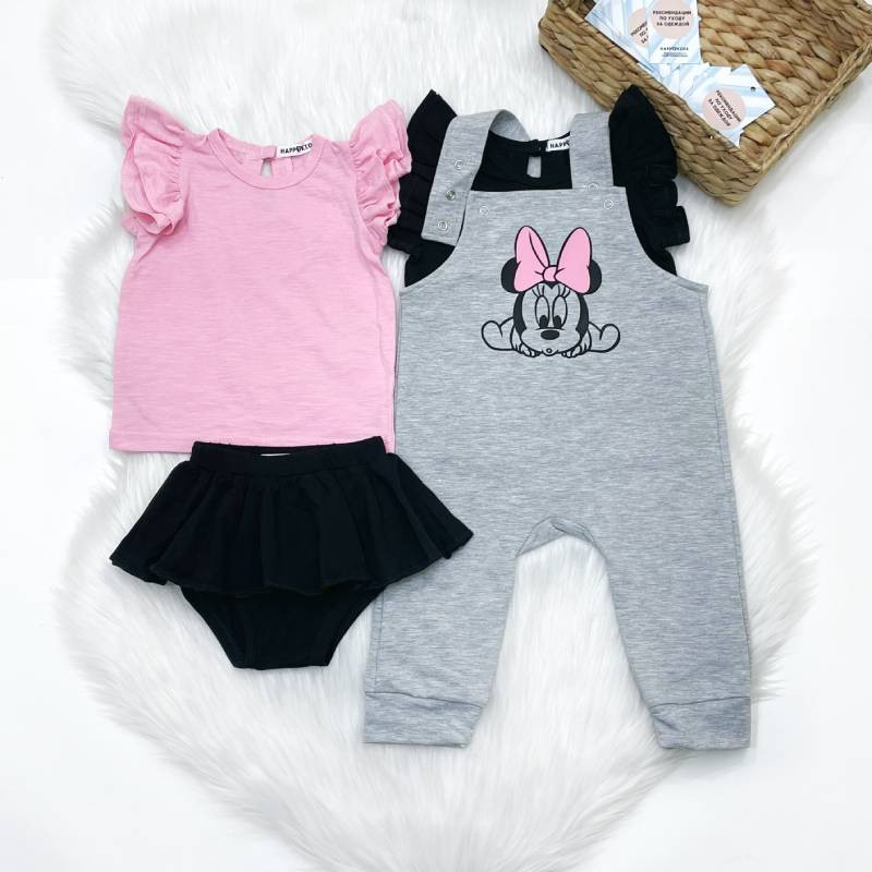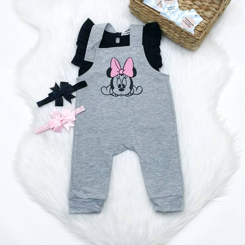 - Полукомбінезон з малюнком Мінні Маус: Що може бути краще за ніжний образ Мінні Маус для вашої маленької модниці? Цей полукомбінезон доповнить будь-який літній образ яскравими фарбами та чарівним дизайном. Зручні застібки дозволяють легко одягати та знімати комбінезон.