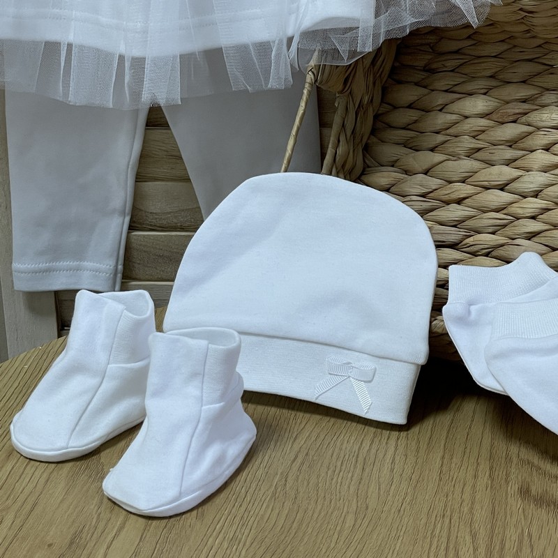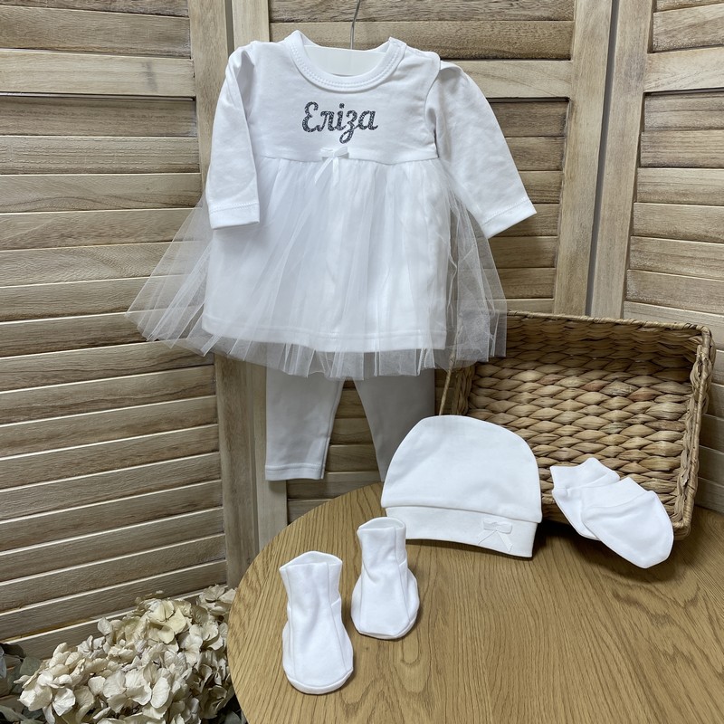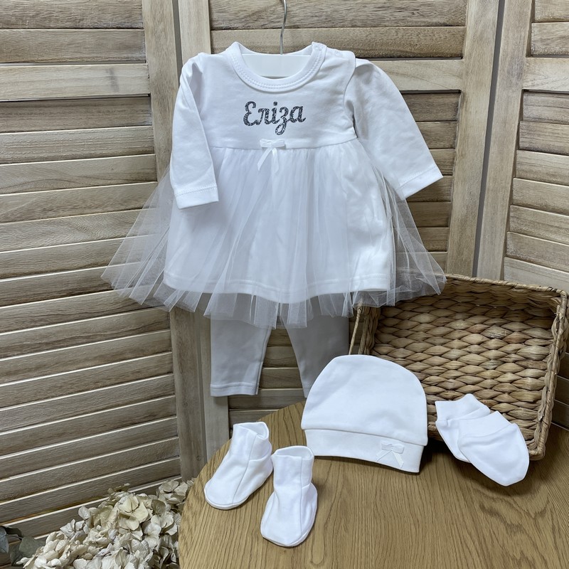 В комплекті 5 одиниць: сукня з іменем дитини, лосіни, шапочка, пінетки, рукавички.