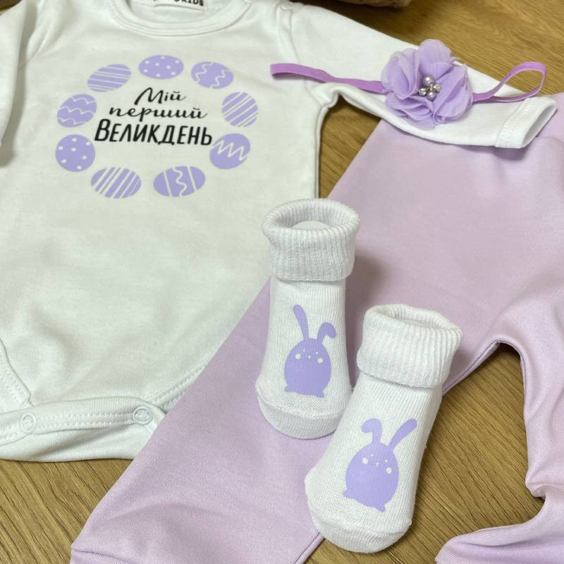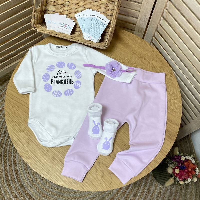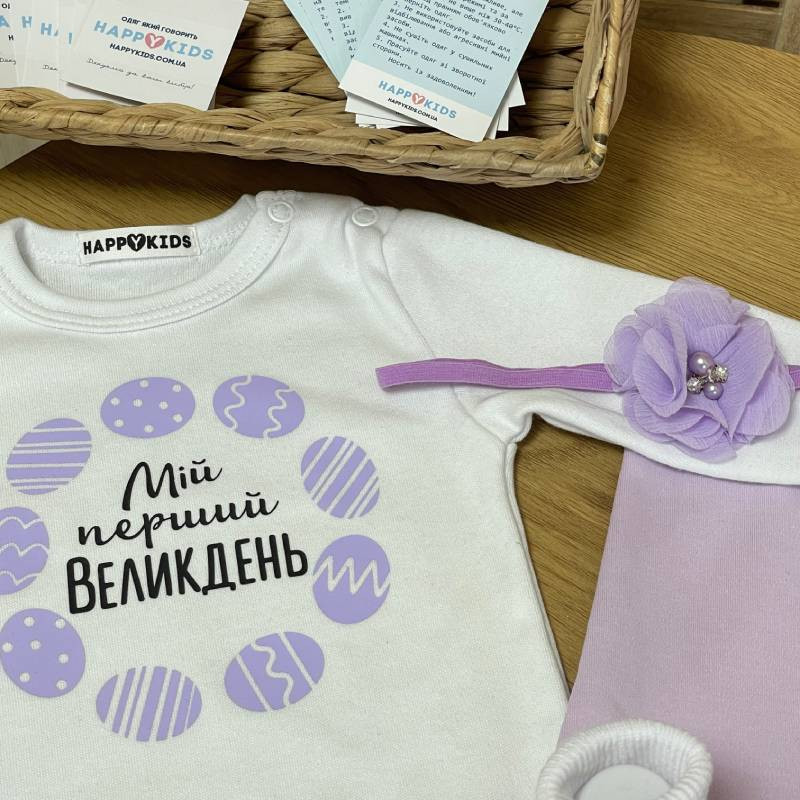 Зберіть незабутні спогади про перший Великдень вашої маленької принцеси за допомогою нашого чарівного комплекту дитячого одягу з ніжним написом "Перший Великдень". Цей чудовий комплект створений для створення незабутнього святкового настрою і зробить святкування особливим.