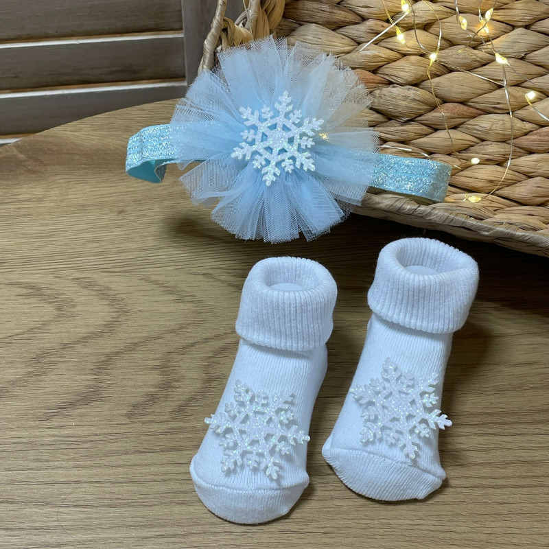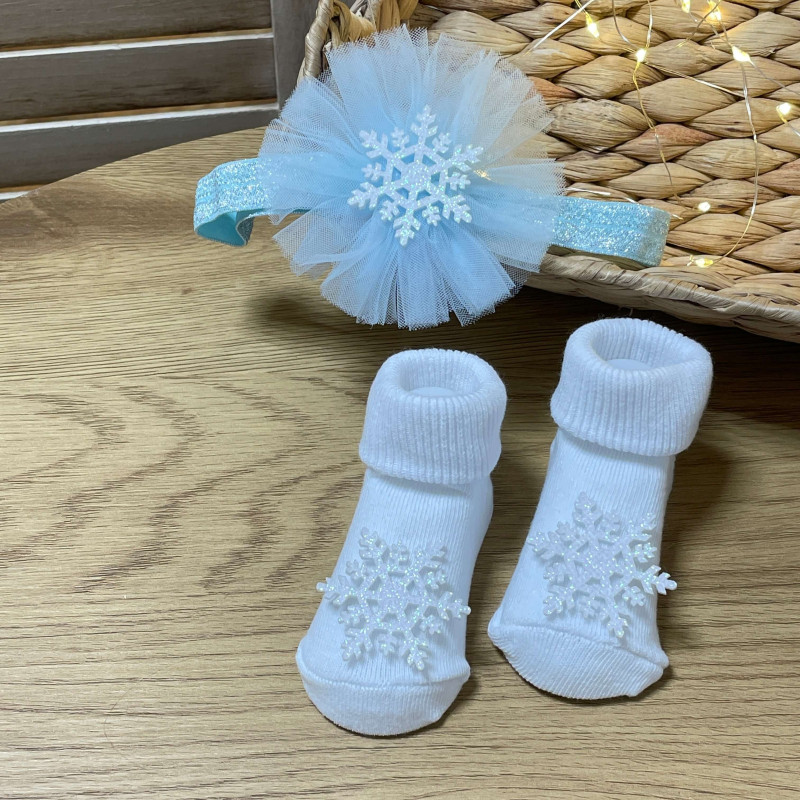 М'яка еластична новорічна різдвяна пов'язка з ніжним блакитним фатином та шкарпетки для маленьких дівчат зі сніжинкою - красивий та стильний аксесуар для новонародженої дівчинки.