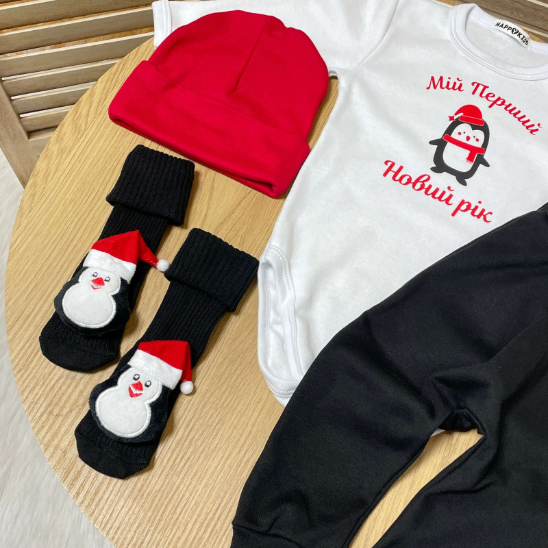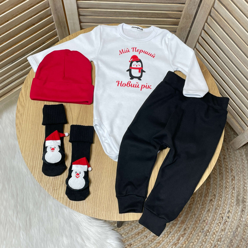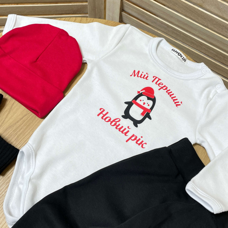 Комплект новорічний для хлопчика з написом "Мій Перший Новий Рік" та веселим малюнком пінгвіна - ідеальний вибір для вашої маленького красунчика цього святкового сезону.
