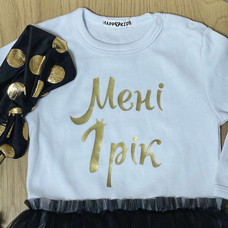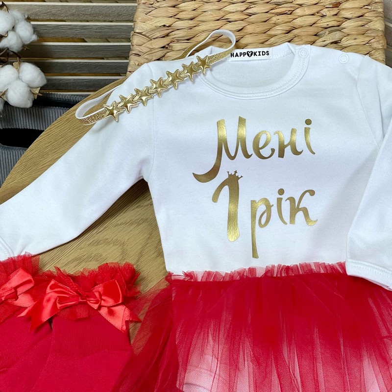 Комплект одягу для дівчинки «Мені 1 рік» складається з ошатного білого боді із золотистим написом, доповненого «повітряною» спідничкою з фатину чорного або червоного кольору. А також, шкарпеток та підв'язкою для волосся. Все, що потрібно для того, щоб іменинниця виглядала бездоганно.