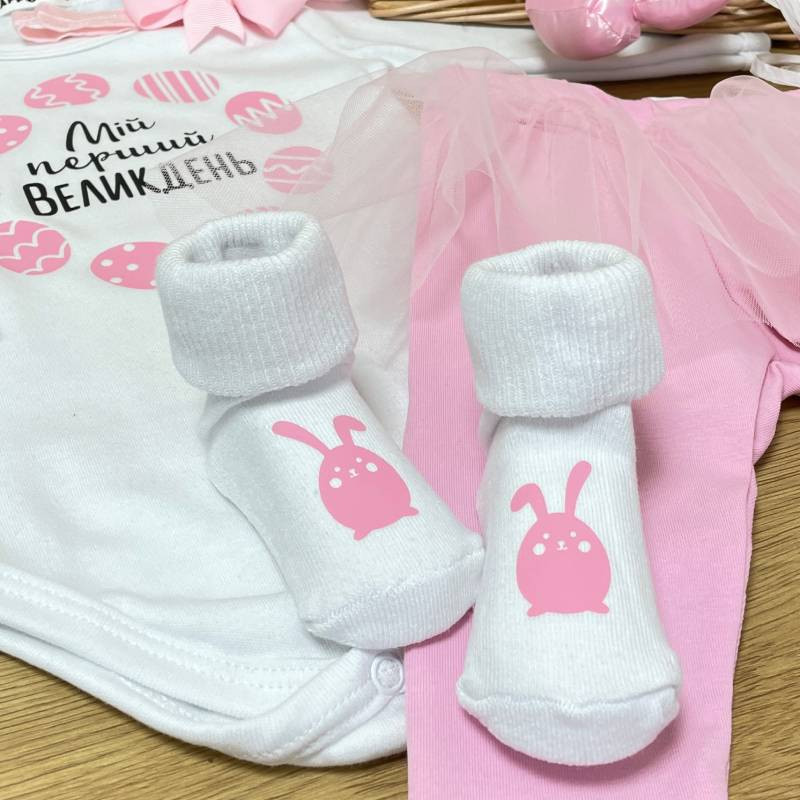 - Дизайн: Комплект включає бавовняне боді з великодніми мотивами — кролики, яйця.