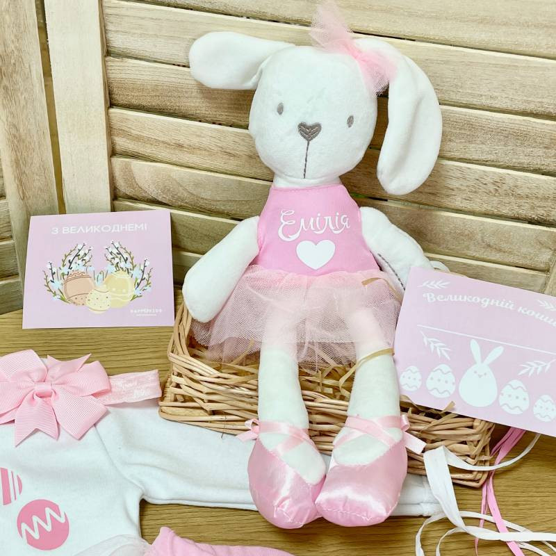 - Комплектація: В комплект входить боді, лосини зі спідничкою, бантик, зайка з іменем дитини.