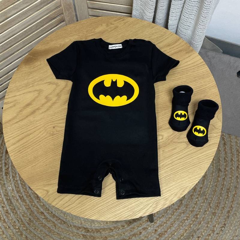 - Дизайн: однотонний ромпер з коротким рукавом та шортиками. Фасон продуманий до дрібниць — зручна застібка на кнопках по низу для швидкої зміни підгузка. Основний акцент — контрастна емблема Бетмена, яка надає образу стильного супергеройського настрою.