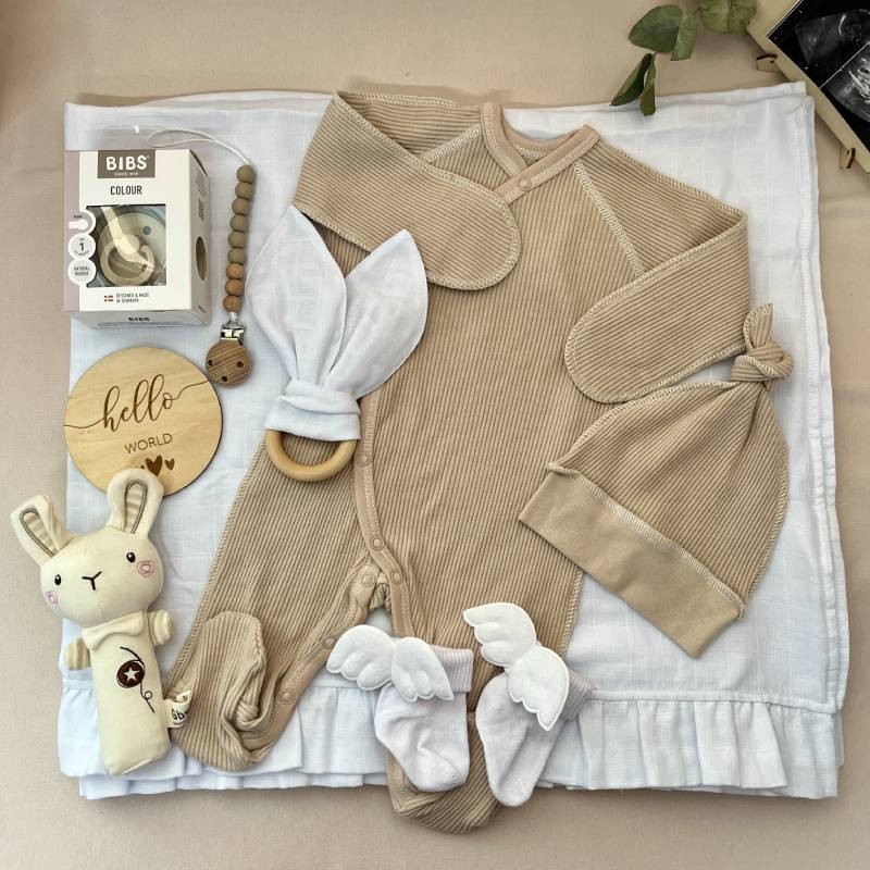 - Переваги: готовий подарунок — не потребує додаткової упаковки, універсальний — підійде і для хлопчика, і для дівчинки, ідеальний вибір для gender party — витриманий у нейтральних кольорах, натуральні матеріали, стильна прозора коробка — підходить навіть як декор у дитячій.