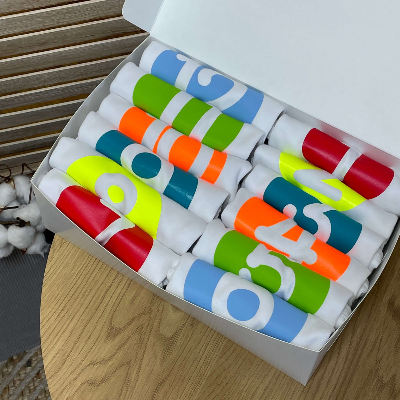 Нарядний набір 12 боді для щомісячної фотосесії першого року життя дитини. Боді з цифрами по місяцях до року допомож робити гарні фотосесії новонародженого кожного місяця