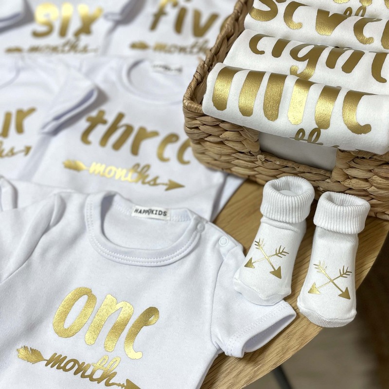 Унікальний набір боді для фотосесій «Стрілочки золоті» складається з 12 виконаних в одному стилі предметів одягу, але різних за розміром. Кожен з яких призначений для певного місяця, і тому чудово виглядатиме на дитині, а вона буде почуватися в кожному з них максимально комфортно.