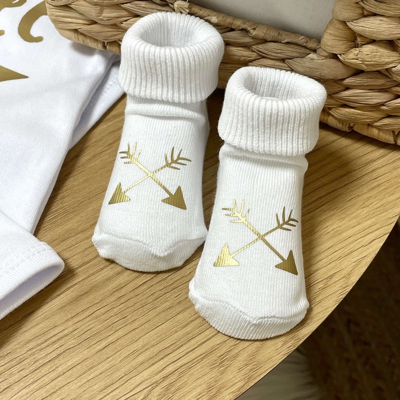 Ну а для того, щоб зробити вигляд малюка ще більш ідеальним, до боді для фотосесій «Стрілочки золоті», можна докупити носочки, що відповідають за стилем, і які чудово доповнять його зовнішній вигляд. Також, такий набір з 12 боді, стане чудовим подарунком малюкові та його батькам, з боку родичів, друзів та близьких людей. Відмінна якість гарантована!