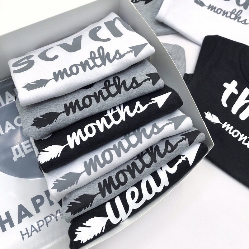 Нарядний набір 12 боді для щомісячної фотосесії першого року життя дитини. Боді з цифрами по місяцях до року допомож робити гарні фотосесії новонародженого кожного місяця