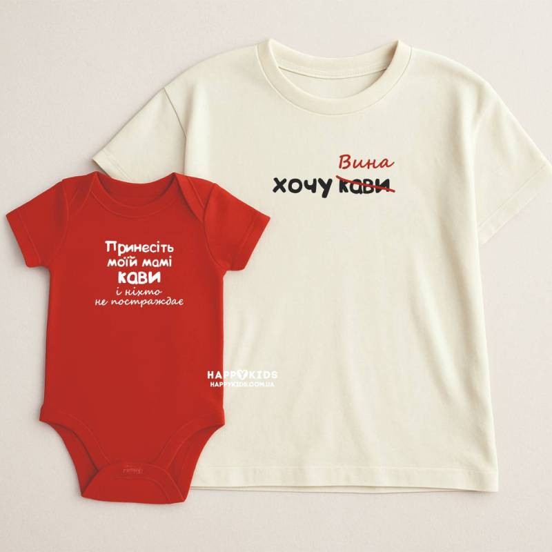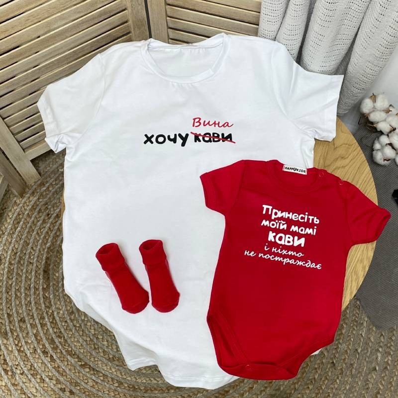 Набір для мами і дитини з жартівливим написом про каву – стиль з ноткою гумору для найрідніших!