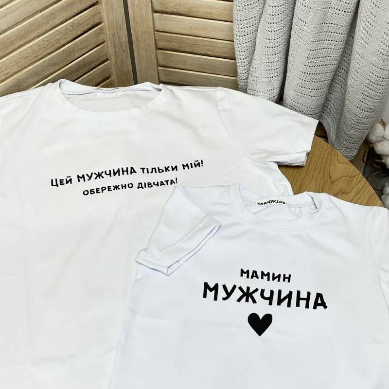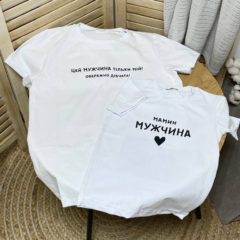 - Дизайн: стильний принт "Цей мужчина тільки мій" + дитяча версія з написом "Мамин мужчина" або аналогічним.